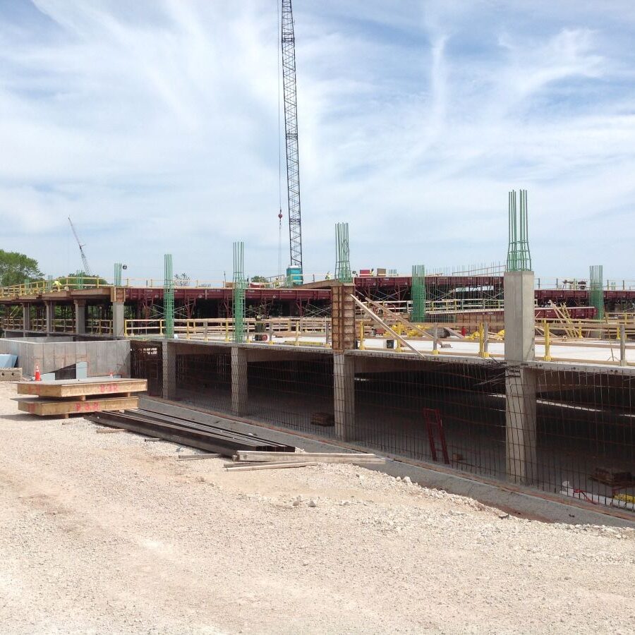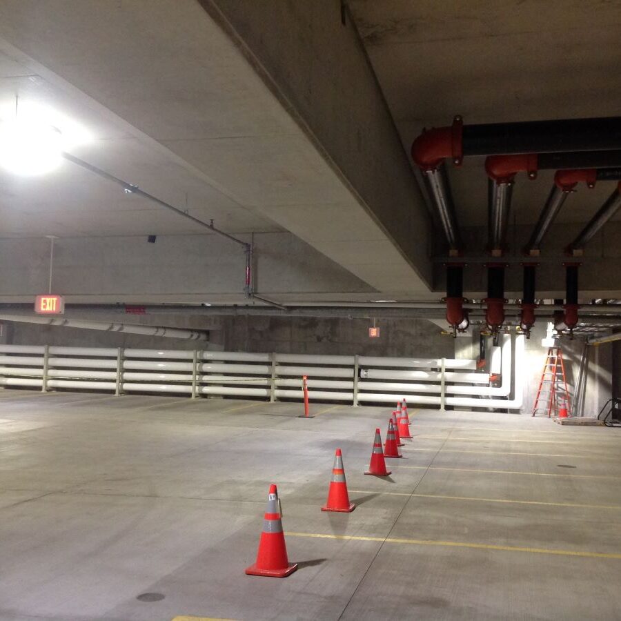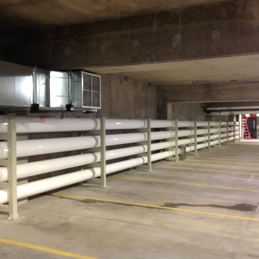 The Parking Structure will provide parking for 700+ vehicles initially and includes one (1) 80,000 SF below grade level which requires a mechanical exhaust system. A 60,000 CFM exhaust and 30,000 CFM ventilation air system serves the Parking Structure with a gas detection system to provide demand-controlled ventilation and the ability to save energy by eliminating the need for continuous exhaust.