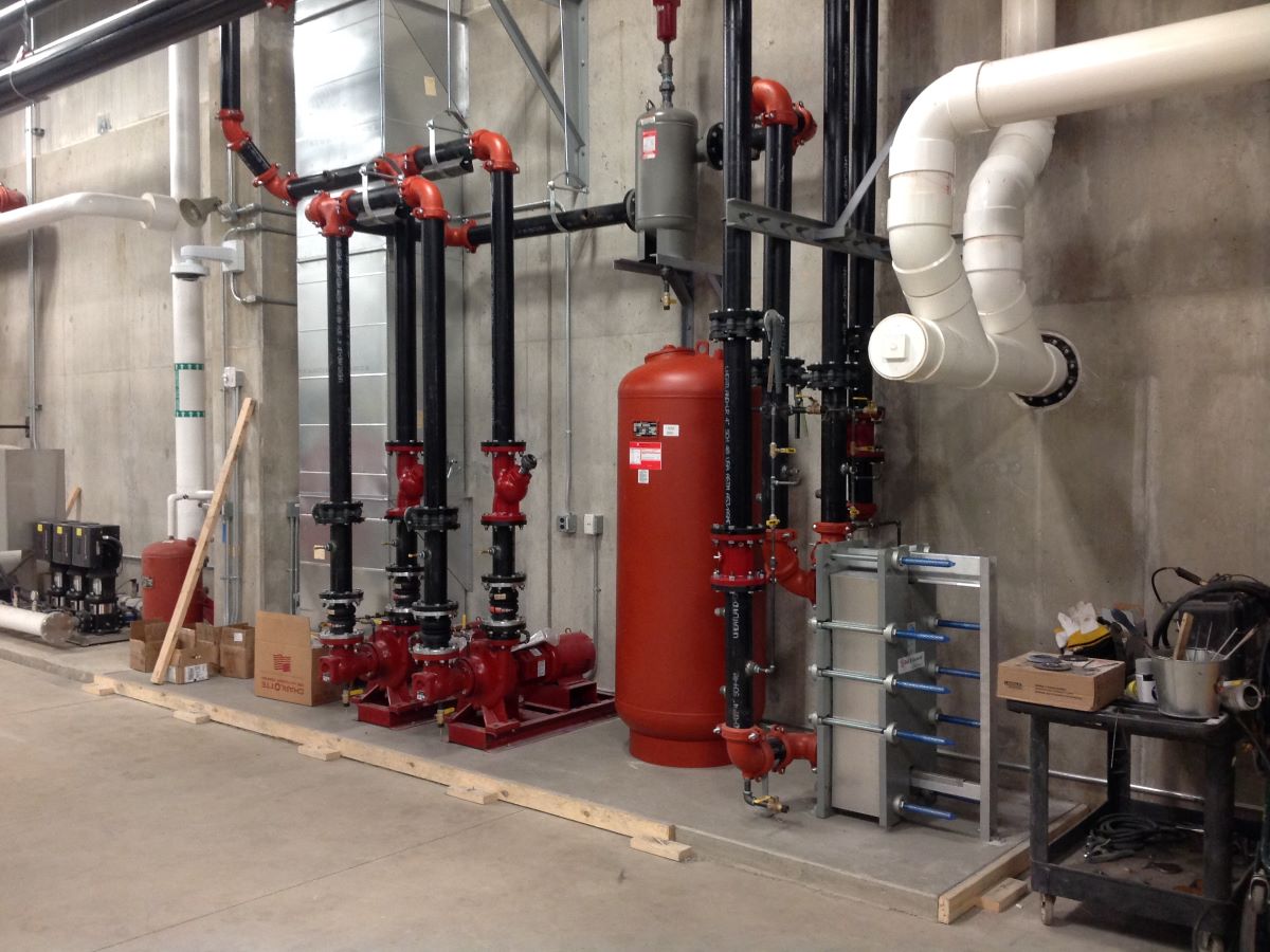 The Recreation Center for is served by two (2) new AHUs and several fan coil units. Hot water and chilled water piping for equipment was connected to the existing central utility plant which was designed by David Grassl at a former employer. The existing utility plant is over 500 feet from the new buildings with piping running through an existing parking structure. New pumps were added for both the chilled water and hot water systems with a new hot water heat exchanger to isolate the glycol for the hot water hydronic system required to feed the new buildings.