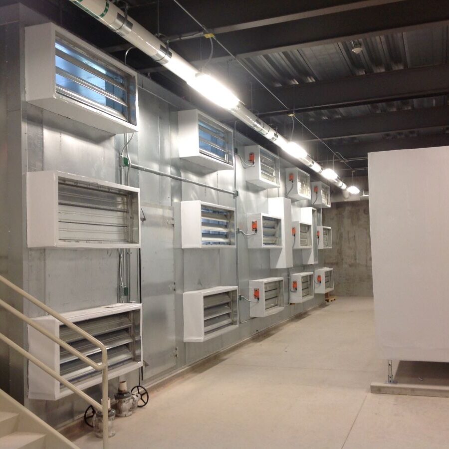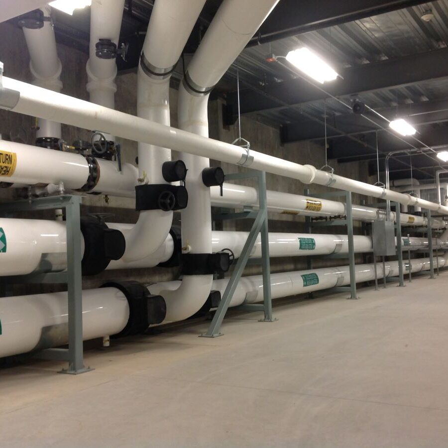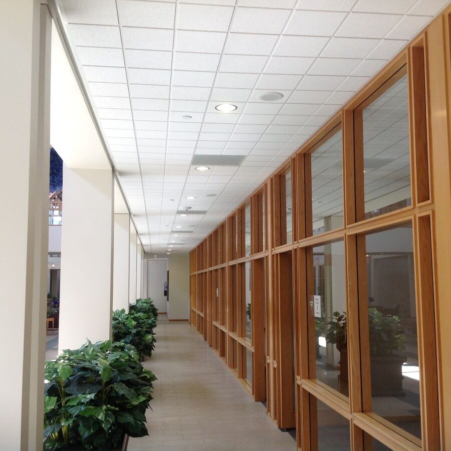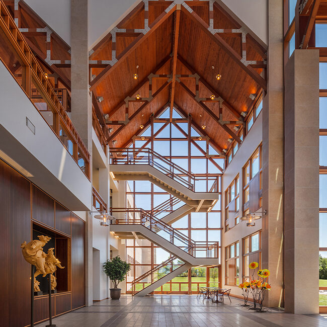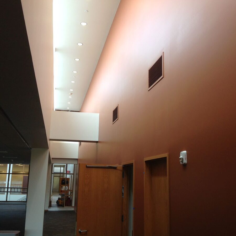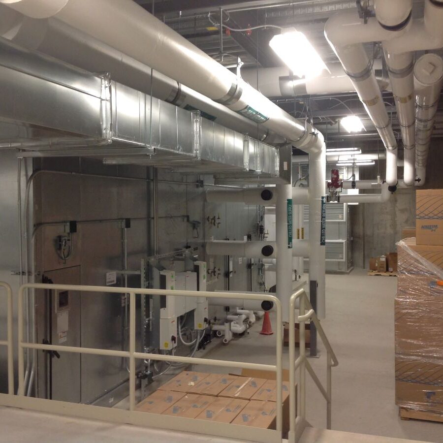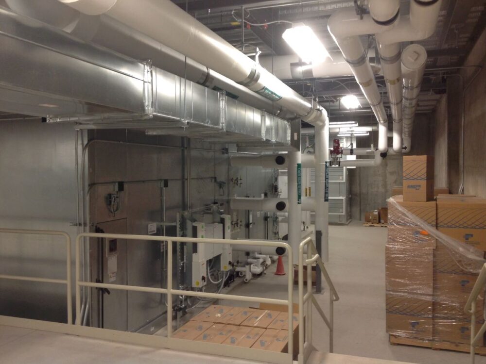 The buildout completes the last portion of the building to be added to the duct distribution system that is connected to three (3) 50,000 CFM air handling units that serve other offices spaces, conference and training rooms, the galleria space, and the fitness center. The new air handling unit is connected to the existing campus chilled water and hot water central utilities plants, which was provided with a valved and capped connection in anticipation of the future tie-in requiring no downtown to the existing campus systems. The air handling units provide low temperature supply air at 50°F to reduce duct sizes and pressure drop while at the zone level, series fan powered VAV boxes are provided to mix the primary and plenum air to deliver air at 55°F to the spaces.