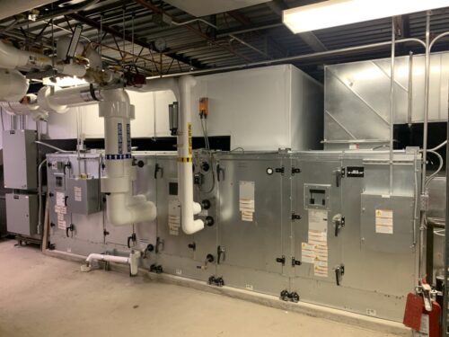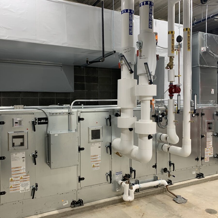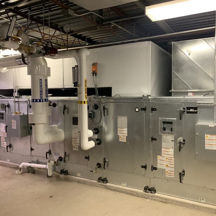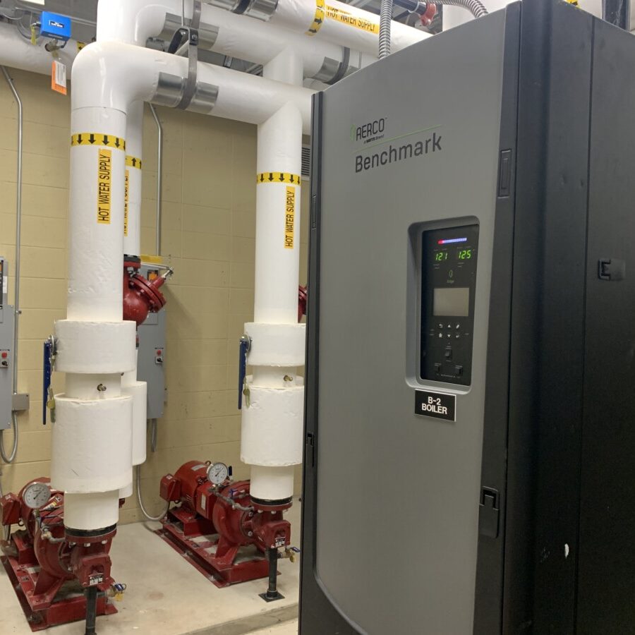 The new building is served by the County chilled water system from an adjacent building and has its own dedicated hot water system consisting of two (2) 2000 MBH condensing boilers in a variable primary flow configuration.