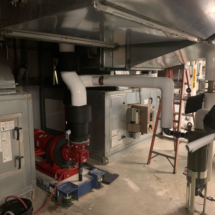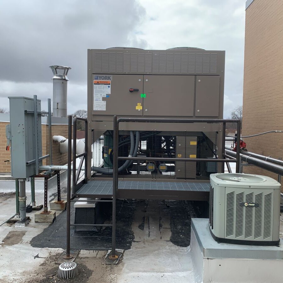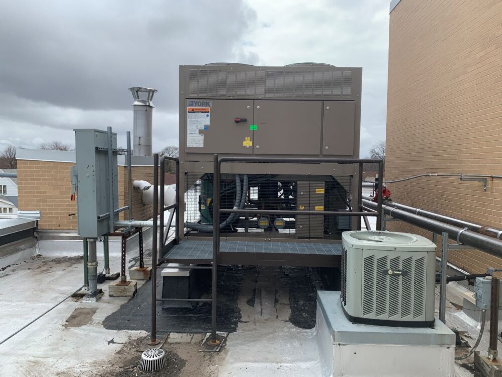Dynamic provided the replacement of an existing 200-ton air cooled chiller with a new unit. The replacement of the existing chiller required the replacement of the existing roof rails that were previously constructed of multiple 2x10s and were partially rotting and in need of replacement. The system chilled water pump was also replaced and equipped with a variable frequency drive and a water filter was added to the system to improve water quality.