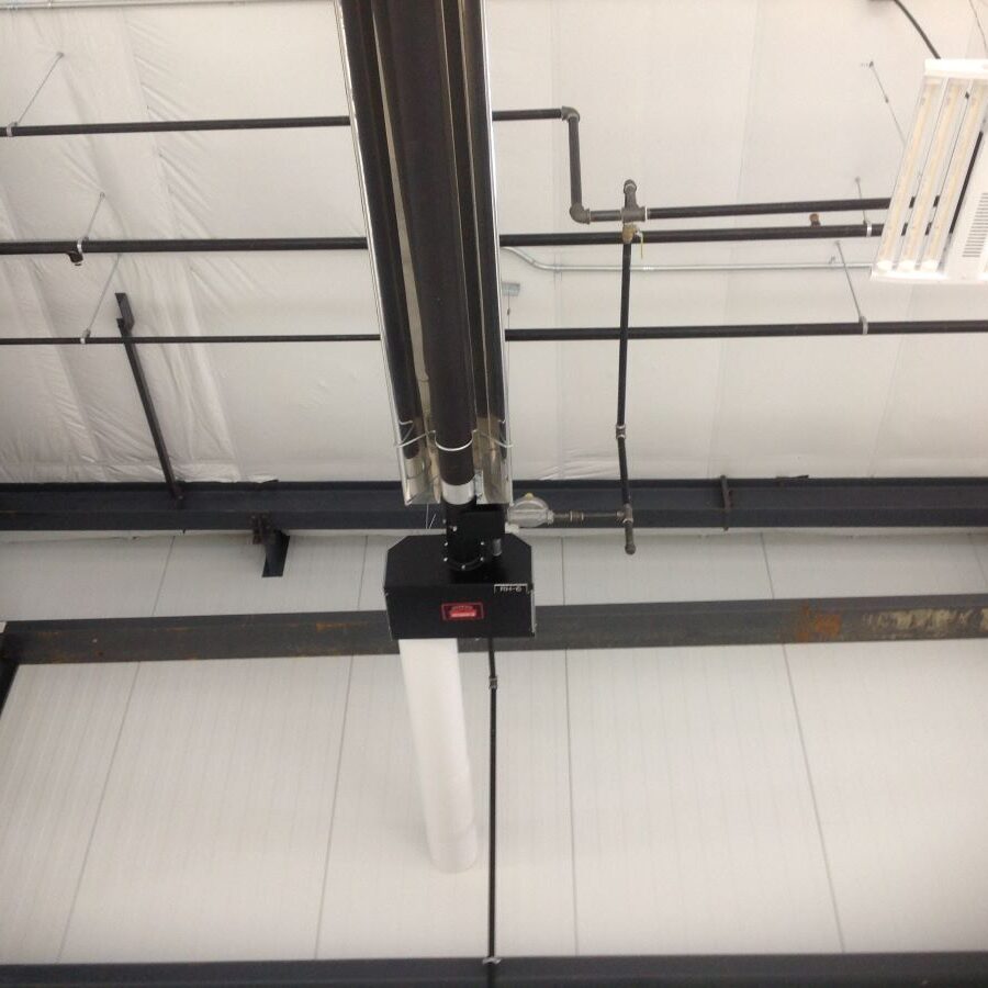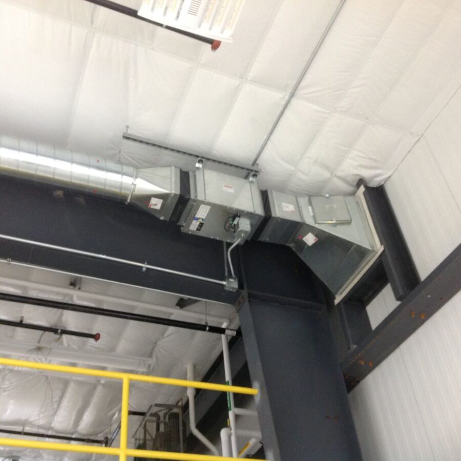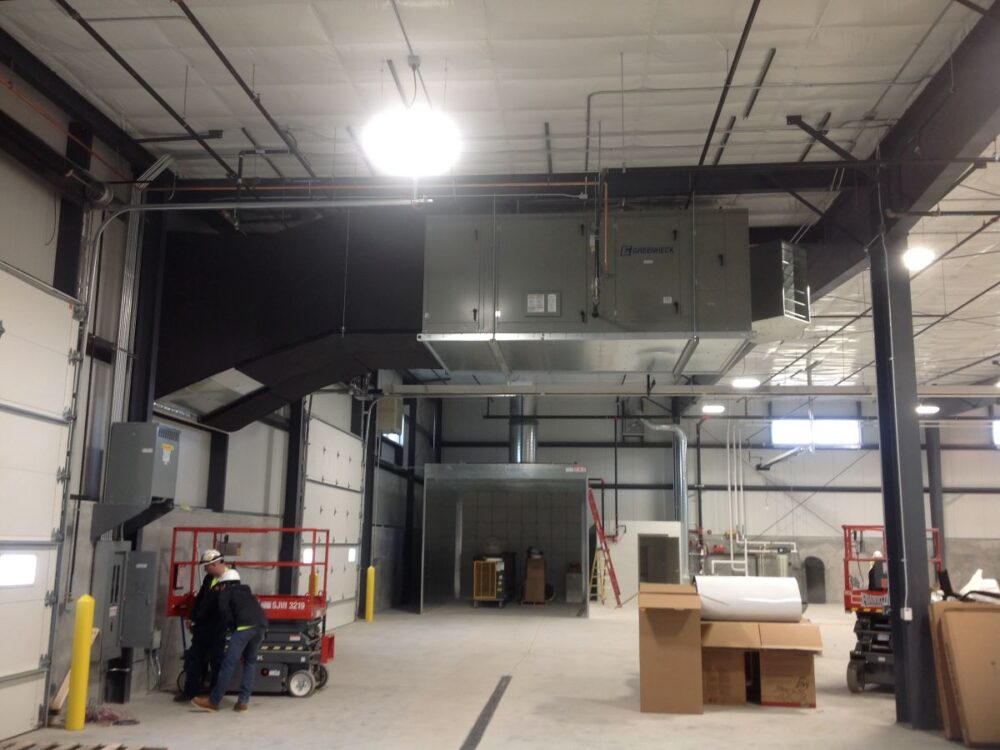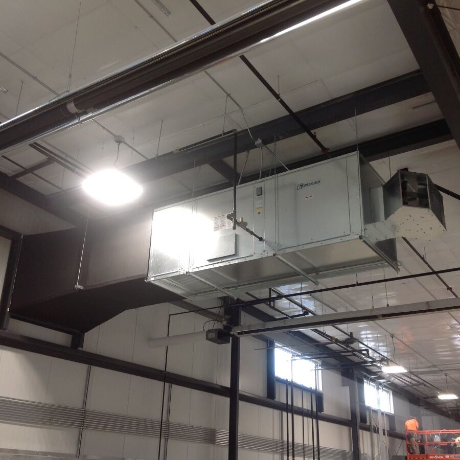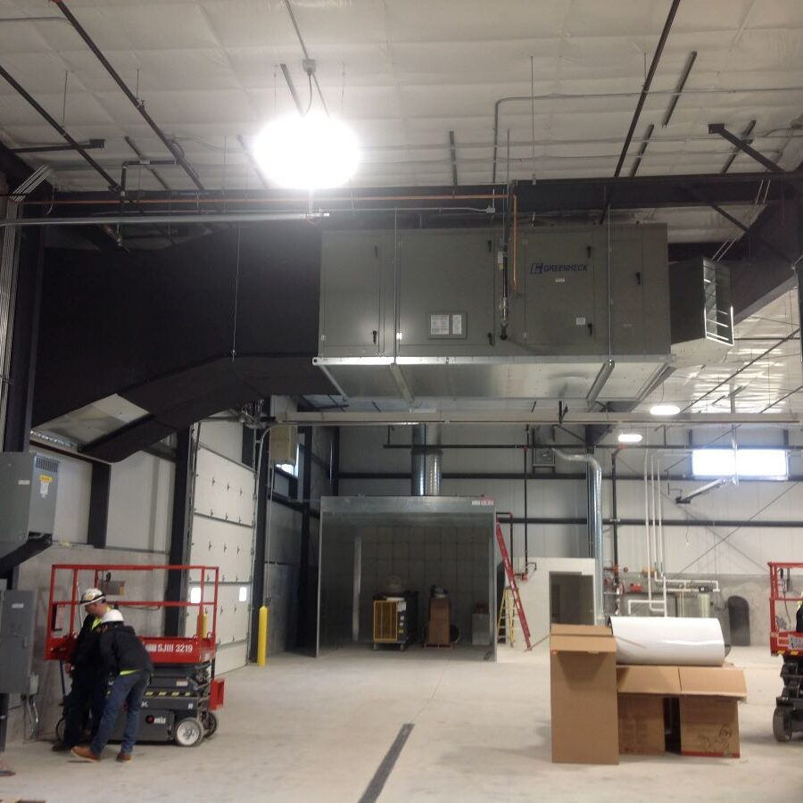 The design of the industrial space includes an infrared radiant heating system consisting of ten (10) low-intensity, tube type heaters that heats the entire space for low energy consumptions compared to forced air, gas fired make-up air unit systems. The building also includes two (2) gas fired make-up air units that are only operated when building exhaust is enabled to maintain building pressurization due to equipment testing. The office space is served by a 6-ton rooftop unit mounted on grade with VAV boxes with electric reheat.