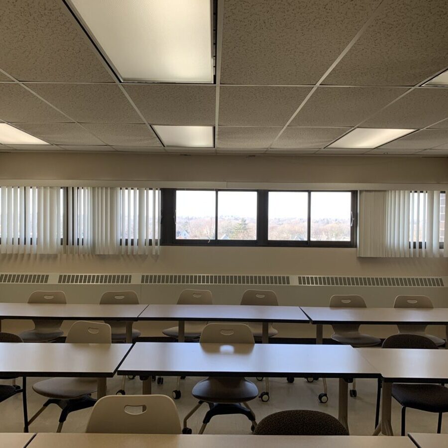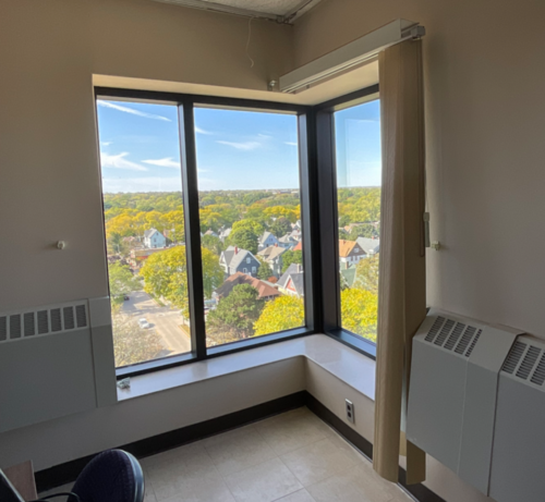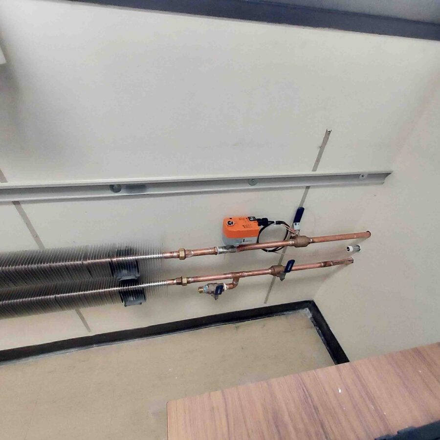One of the main goals of this project was to improve occupant comfort as air infiltration and failing window construction was causing issues within the building. Fin pipe radiation was added around the perimeter of the building to address cold issues at the exterior walls and additional zoning was added to improve occupant control. Additionally, at the four (4) corners of the building, the curtainwalls were completely removed and replaced with new, better performing windows to reduce water and air infiltration that users have experienced. Around the perimeter of the building, careful coordination and mock-ups were completed to determine the vertical pipe drop locations, fin pipe elevation above the floor, and color matching to ensure a complete installation to avoid conflicts with electrical outlets and existing conditions. This careful coordination eliminated the need to open any existing walls for new pipe drops to the fin pipe radiation.